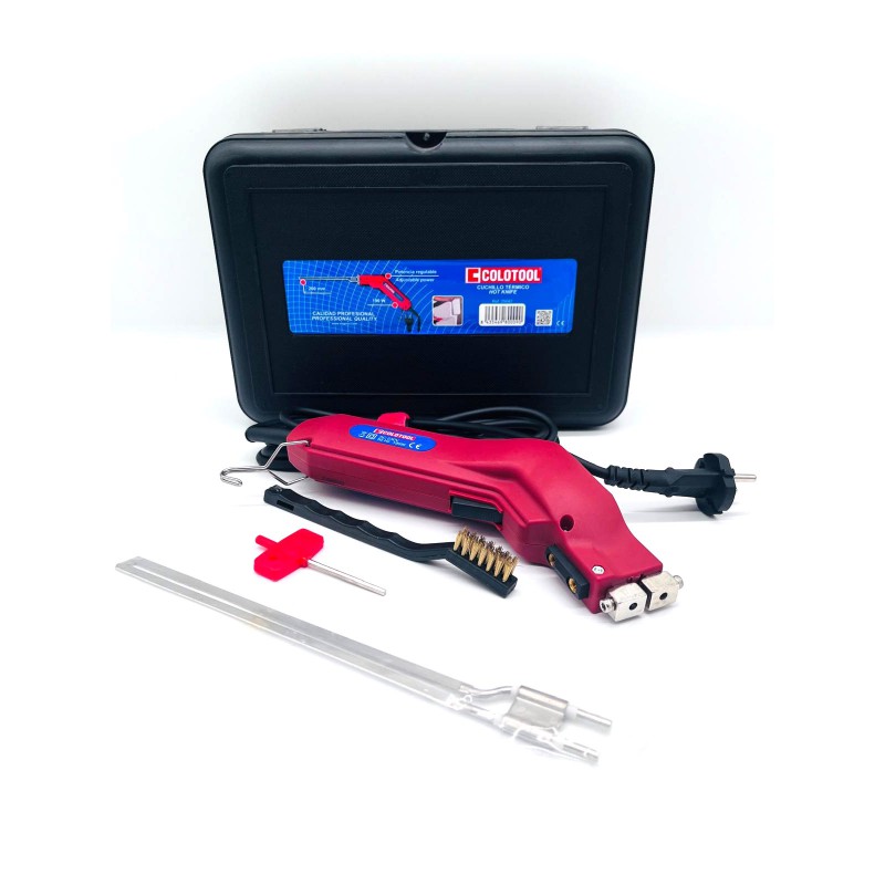 El cuchillo viene en una maleta de plástico con una cuchilla de 200 mm, un cepillo de alambre y una llave para fijar la cuchilla.